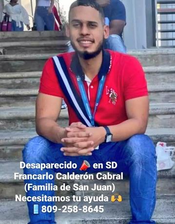 Santo Domingo.- Familiares del joven Francarlo Calderón Cabral solicitan la colaboración de toda la ciudadanía para dar con el paradero de su pariente, que se encuentra desaparecido desde el pasado jueves 16 del presente mes, a las 4:00 de la tarde.