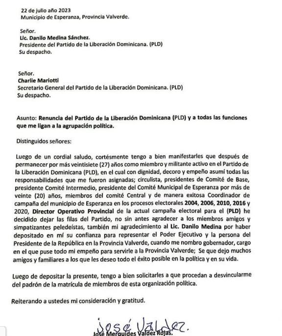 “Mi agradecimiento al presidente Danilo Medina por haber depositado en mi la confianza para representar el Poder Ejecutivo en la provincia de Valvede”, señala en su carta de renuncia del PLD.