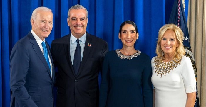 El presidente dominicano Luis Abinader y la Primera Dama Raquel Arbaje, junto al presidente de Estados Unidos, Joe Biden y su esposa Jill Biden, durante la cena ofrecida por el mandatario norteamericano a los jefes de Estado y de Gobierno, en el marco de la 78vo Asamblea General de las Naciones Unidas.