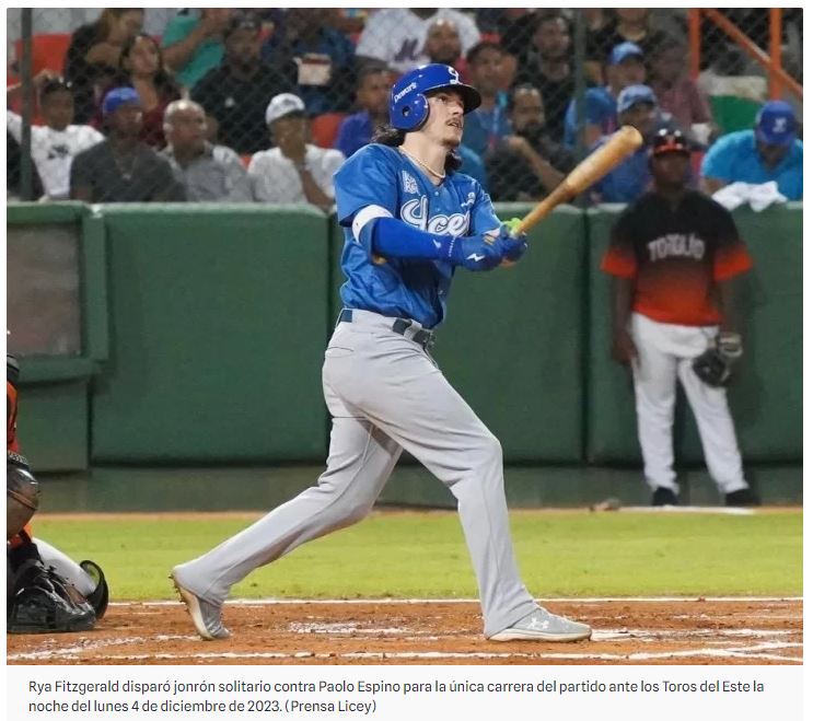 Ryan Fitzgerald disparó un jonrón solitario en el tercer episodio y el pitcheo de los Tigres del Licey se las arregló para contener en siete hits y sin carreras a los Toros del Este para un triunfo 1-0 en el Estadio Francisco Micheli, la noche de este lunes, en el retorno del campeonato otoño-invernal después de la pausa del fin de semana del Juego de Estrellas.