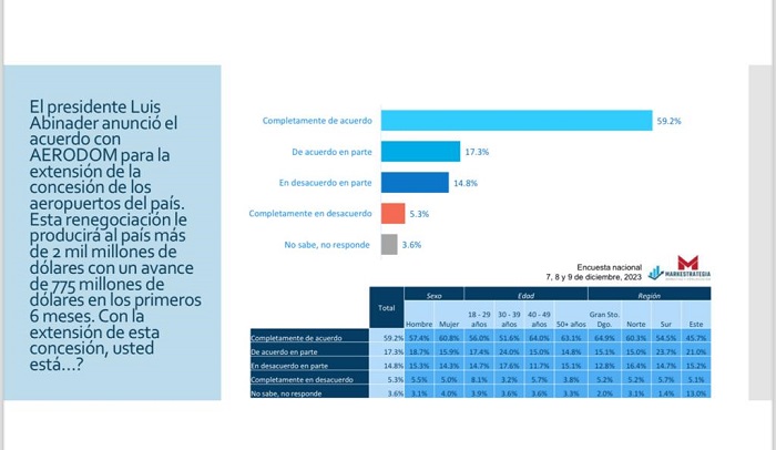 Al preguntarles sobre la renegociación del contrato de AERODOM para la extensión de la concesión de los aeropuertos del país, el 59.2% se mostró completamente de acuerdo.