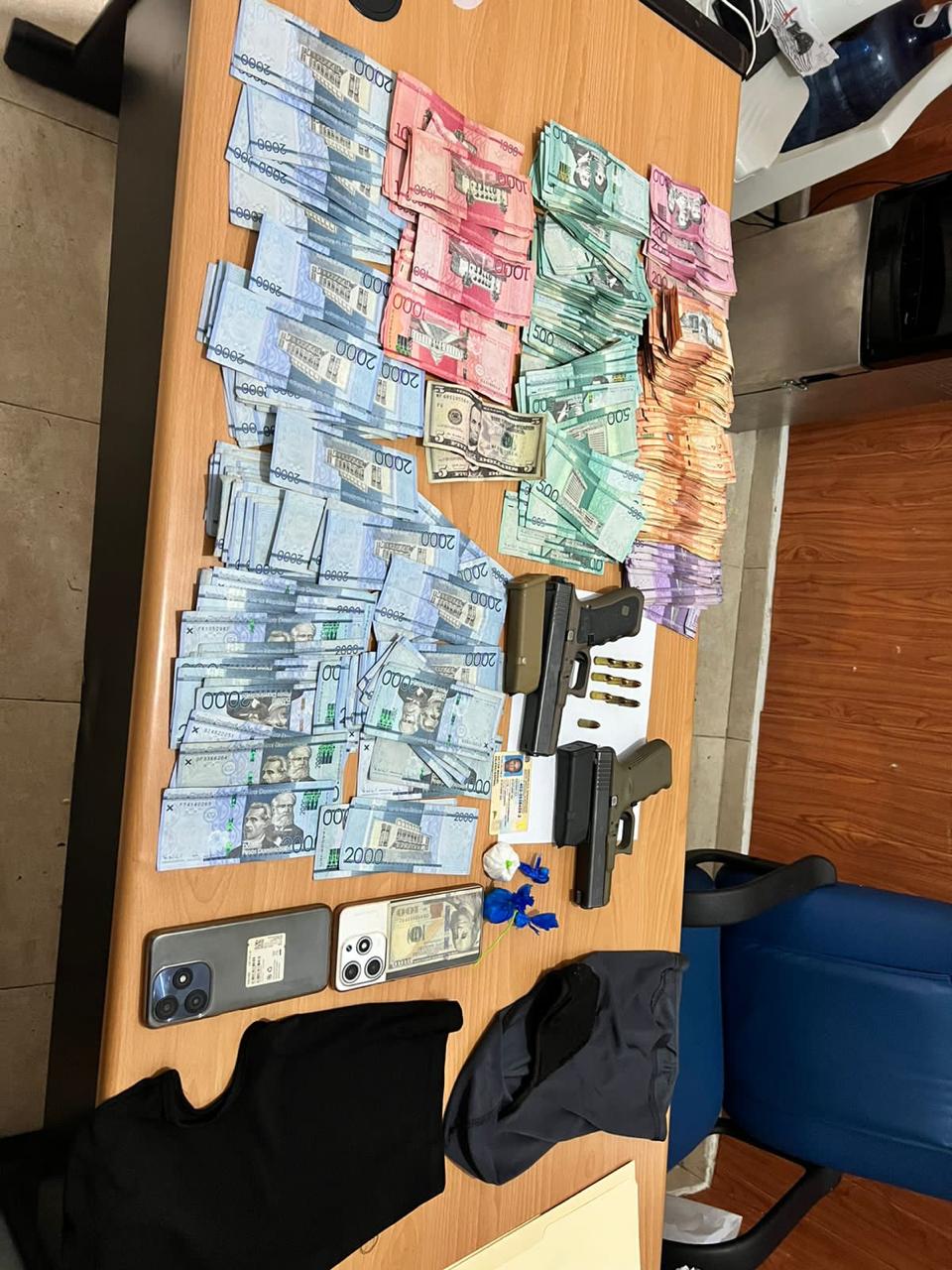 Mientras que en poder de Colón se ocupó la pistola marca Glock 17, 9mm, serial VAC658, con 6 cápsulas en su cargador, sin ningún tipo de documentos y la suma de 300,000 pesos en efectivo.
