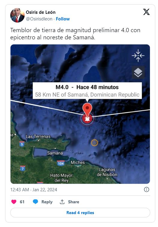 La información la ofreció el geólogo Osiris de León, a través de una publicación en su cuenta de la plataforma X, donde además indicó que el sismo ocurrió a las 11:55 de la noche y tuvo epicentro a 58 kilómetros al noreste de Samaná.
