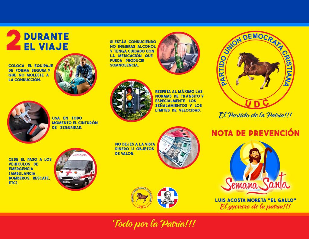Santo Domingo.-El presidente de la Unión Demócrata Cristiana –UDC-, Luis Acosta Moreta, Luis “El Gallo”, hizo un llamado a las autoridades para que desde este momento comiencen toda la planificación de la Semana Santa dominicana, para evitar muertes por accidentes de automotores, ahogados, y que se privaticen las playas.