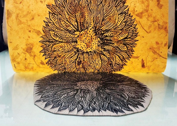 “Este juego constante con la apariencia desafía al ojo experto, incitando al observador a cuestionar la realidad de la imagen presentada: ¿una linoleografía que simula ser serigrafía, o viceversa? La conexión intrínseca de Guerrero con su terruño, las vastas lomas de café, los girasoles, y el viento impetuoso de Baní en la República Dominicana, se manifiesta en sus creaciones.