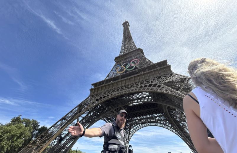 El hombre sin camisa fue visto escalando la torre de 330 metros (1.083 pies) de altura por la tarde. No está claro dónde comenzó su ascenso, pero fue observado justo encima de los aros olímpicos que adornan la segunda sección del monumento, justo encima del primer mirador.