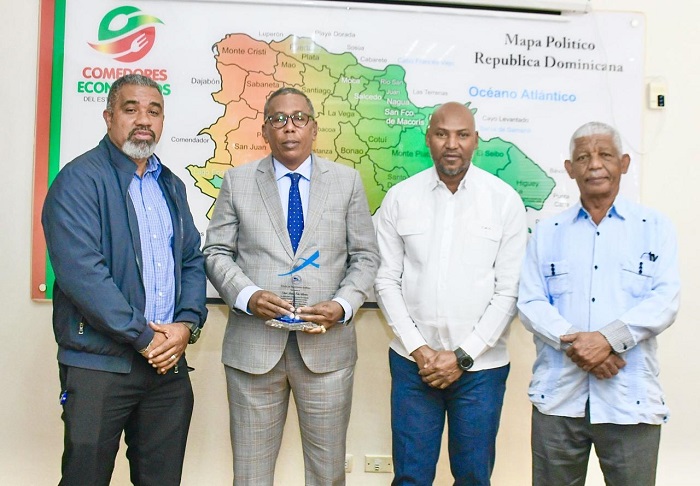 Corpus Montero, presidente del Círculo de Reporteros Gráficos junto a José Ramón Rubén, vicepresidente y José Jerónimo de la Comisión de Ética, entregaron una placa de reconocimiento a Féliz Méndez, por el trabajo realizado al frente de Comedores Económicos, en favor de la población más vulnerable.