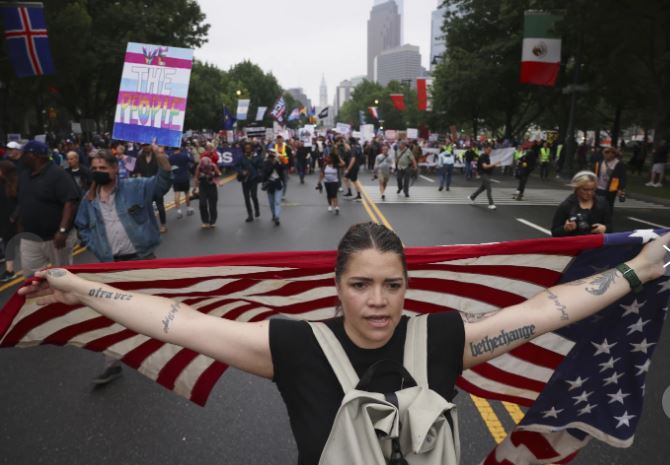 Una mujer con una corona de hule espuma de la Estatua de la Libertad llevó un sistema de altavoces y dirigió un canto antiTrump, cambiando la palabra “joven” en la canción “Y.M.C.A.” por “estafador”.