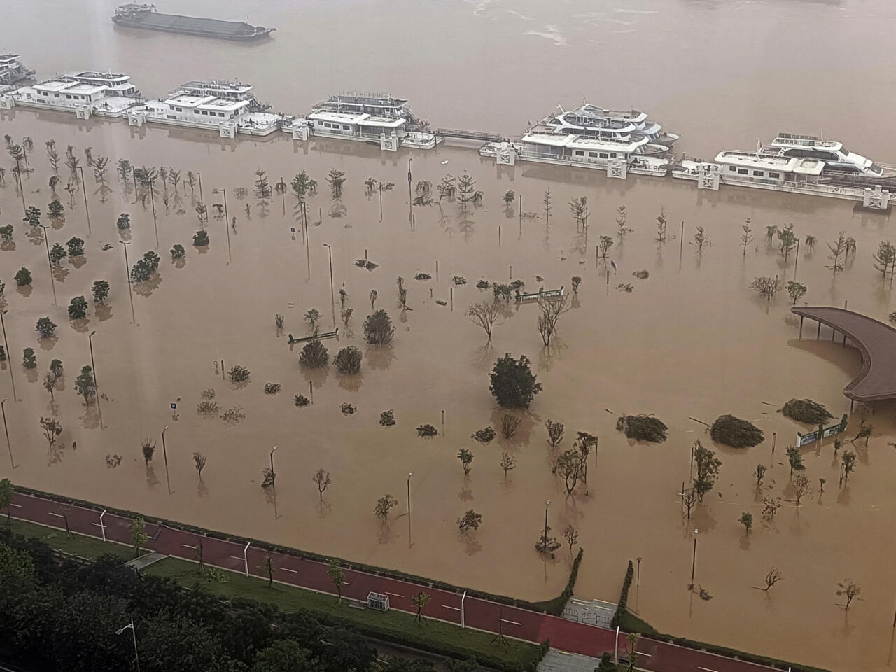 El río Suijiang se desbordó en una zona urbana y convirtió amplias zonas de calles en canales. Las imágenes aéreas mostraban edificios de apartamentos de gran altura y árboles verdes sobresaliendo de un mar de agua color lodo. En algunas partes, el agua alcanzaba aproximadamente la mitad de la primera planta y dejaba visibles solo la parte superior de los automóviles.