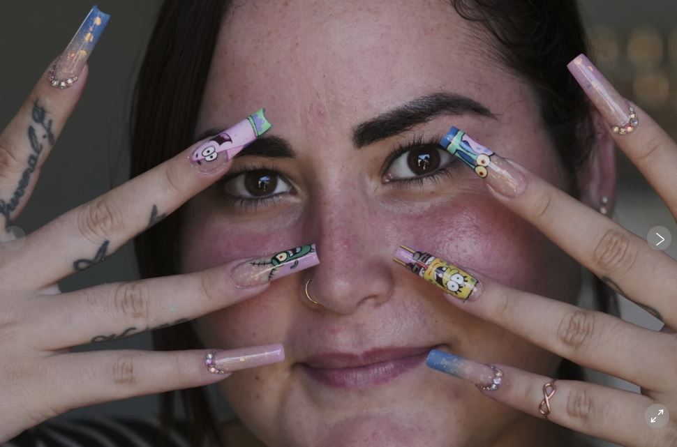 Las uñas que Darias, de 26 años, le decoró a su clienta Mariam Camila Sosa sobresalían por lo menos dos centímetros de largo: Bob Esponja y Patricio Estrella —los personajes de la serie— mostraban los inmensos ojos en sus rostros de grandes sonrisas con sus característico color amarillo y rosado, respectivamente.