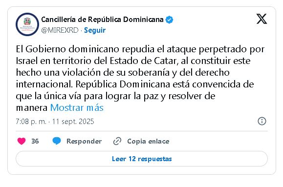 El Gobierno dominicano repudió el ataque perpetrado por Israel en territorio de Qatar con el objetivo de matar a los miembros de la delegación negociadora del grupo palestino Hamás.