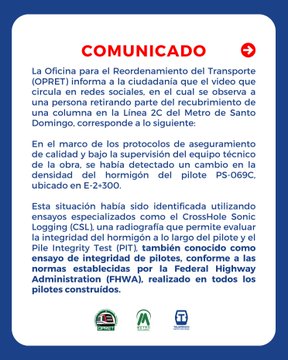 La institución agregó que se están corrigiendo otros puntos similares a lo largo de la Línea 2C, que se construye hacia Los Alcarrizos, utilizando materiales certificados y siguiendo altos estándares de ingeniería.