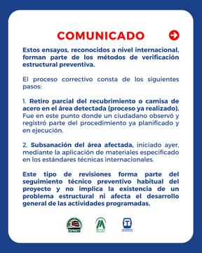 La Opret señaló que este tipo de revisiones forman parte del control preventivo regular de la construcción y “no implican la existencia de un problema estructural ni afectan el cronograma de actividades de la obra”.