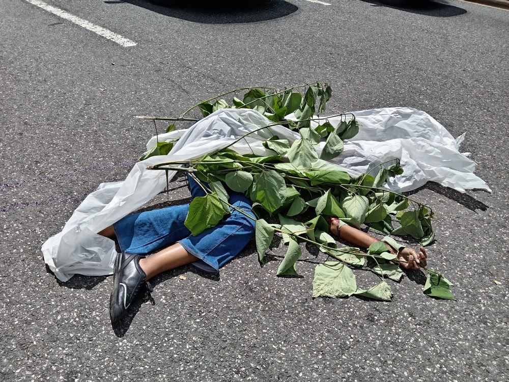 La fémina, vestía palones jean azul, blusa blanca y tenis negros, su cuerpo estaba cubierto por ramas de palma y un pedazo de tela blanco.