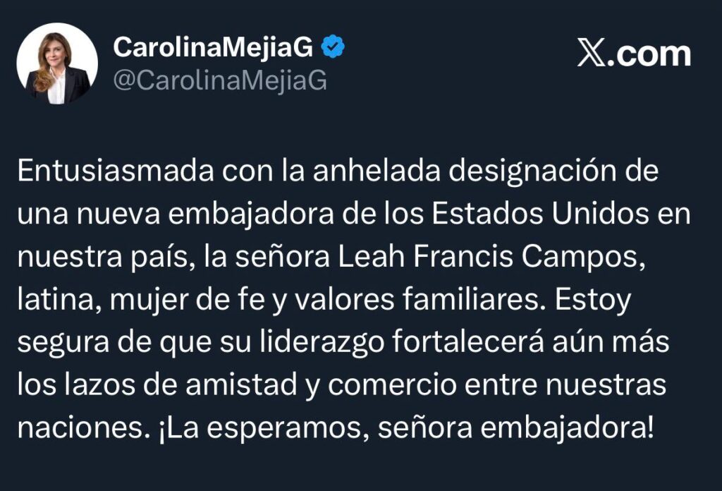 “Entusiasmada con la anhelada designación de una nueva embajadora de los Estados Unidos en nuestro país, la señora Leah Francis Campos, latina, mujer de fe y valores familiares. Estoy segura de que su liderazgo fortalecerá aún más los lazos de amistad y comercio entre nuestras naciones. ¡La esperamos, señora embajadora!”, manifestó la alcaldesa de la capital dominicana en una publicación en su cuenta de X.