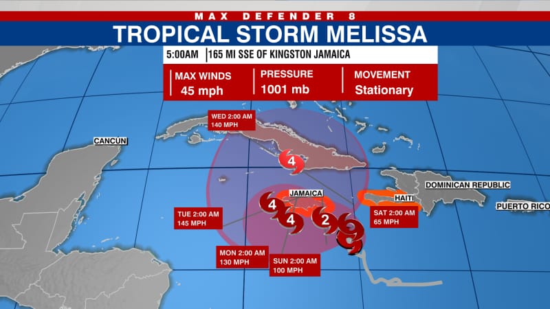 Sobre el huracán Melissa de categoría 5 en la escala de Saffir-Simpson explica que se ubica en la latitud 17.2 que se desplaza al suroeste de Guantánamo (Cuba), moviéndose hacia el nor/noreste a 7 km/h. Posee vientos máximos sostenidos de 280 km/h con ráfagas superiores.