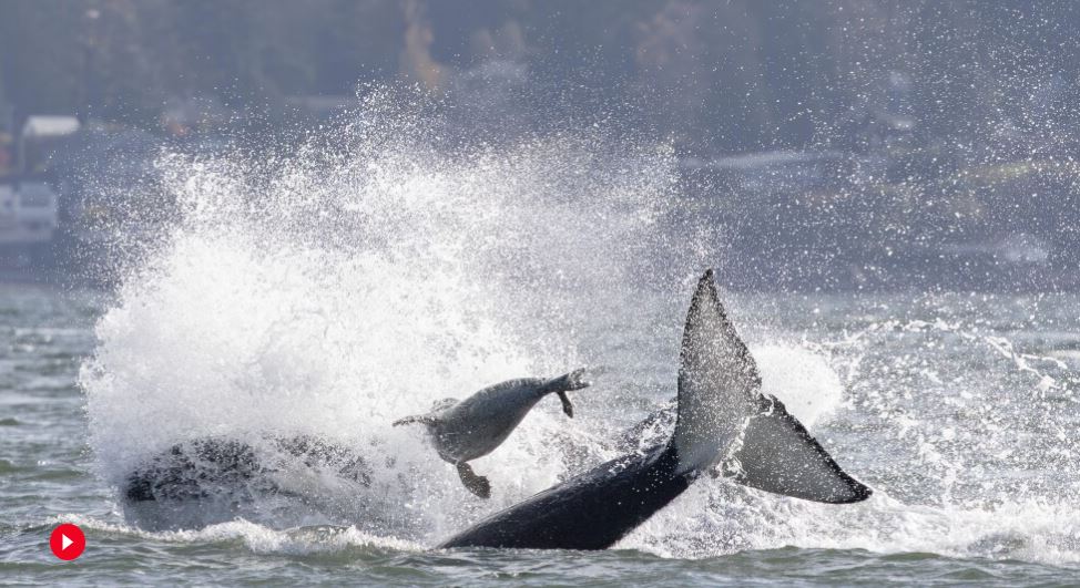 SEATTLE (AP) — Una fotógrafa de vida silvestre que realizaba un viaje de avistamiento de ballenas en aguas cercanas a Seattle capturó videos y fotos impactantes de una manada de orcas cazando una foca que sobrevivió únicamente trepando a la popa de su barco.