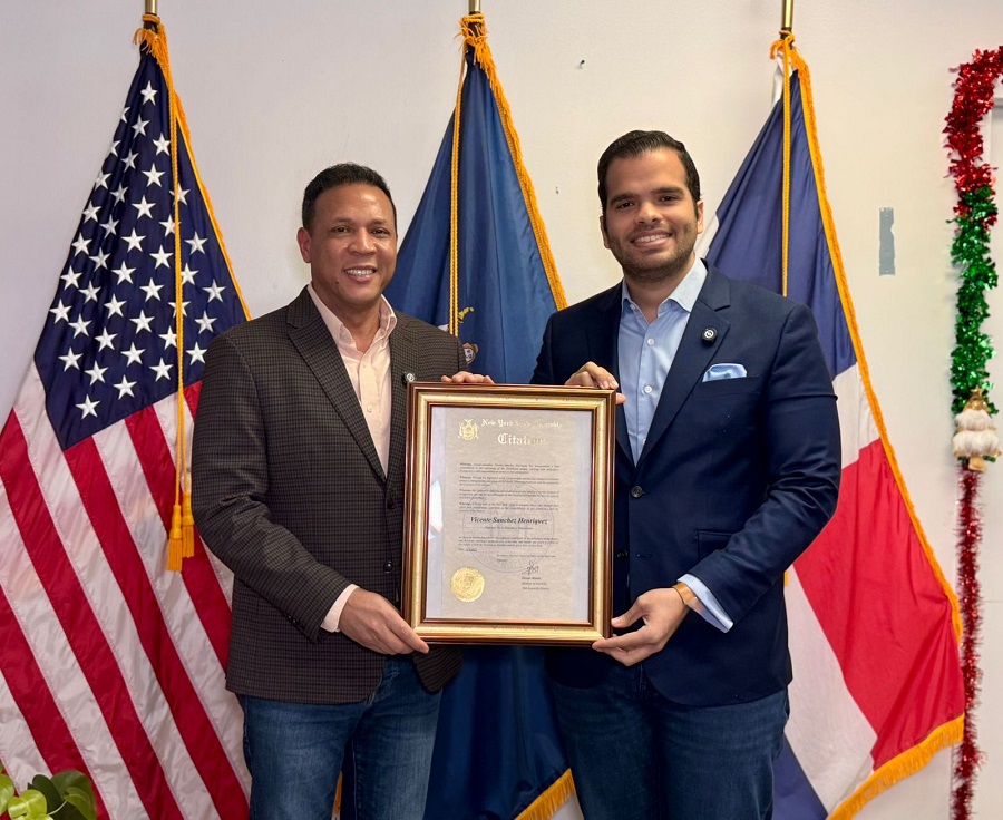 NUEVA YORK. – El diputado oficialista de la circunscripción 1 del Distrito Nacional por el Partido Revolucionario Moderno (PRM), Vicente Sánchez Henríquez, fue recibido por el asambleísta George Álvarez (AD78) quien entregó una placa de reconocimiento al congresista.