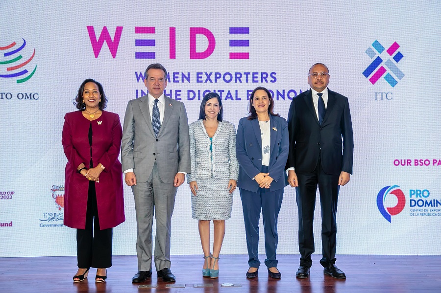 La Secretaría de la Organización Mundial del Comercio (OMC) representada por Johanna Hill, Directora General Adjunta; y el Centro de Comercio Internacional (ITC); representado por Pamela Coke-Hamilton, Directora Ejecutiva, en alianza con el Centro de Exportación e Inversión de la República Dominicana (ProDominicana), representado por su Directora Ejecutiva, Biviana Riveiro Disla, con la presencia del Ministro Victor Bisonó, Ministro de Industria Comercio y Mipypmes (MICM), presentaron oficialmente el Fondo para Mujeres Exportadoras en la Economía Digital (WEIDE, por sus siglas en inglés) en República Dominicana con el objetivo de incrementar la participación femenina dominicana en el comercio internacional.