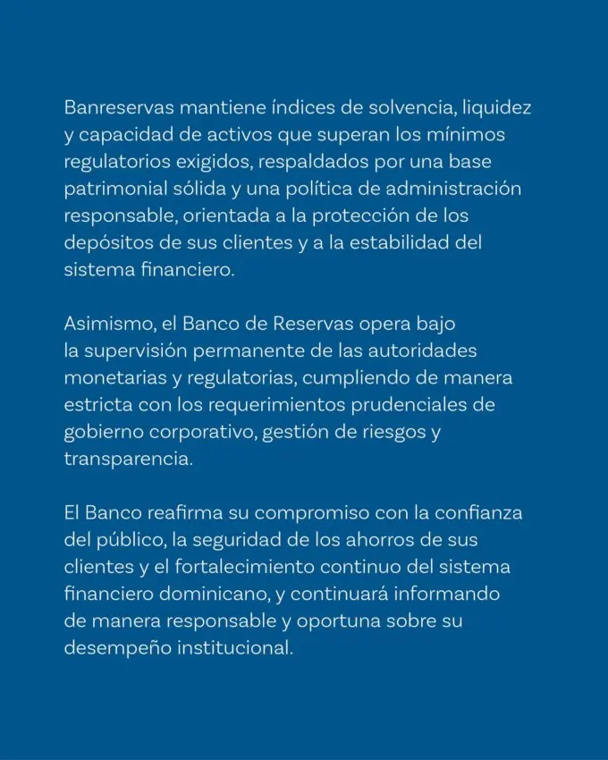 “Banreservas mantiene índices de solvencia, liquidez y capacidad de activos que superan los mínimos regulatorios exigidos, respaldados por una base patrimonial sólida y una política de administración responsable, orientada a la protección de los depósitos de sus clientes y a la estabilidad del sistema financiero”, señala el comunicado.