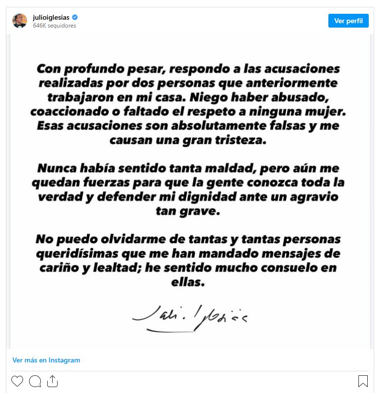 “Con profundo pesar, respondo a las acusaciones realizadas por dos personas que anteriormente trabajaron en mi casa. Niego haber abusado, coaccionado o faltado el respeto a ninguna mujer. Esas acusaciones son absolutamente falsas y me causan gran tristeza”, publicó el cantante en su perfil de Instagram.