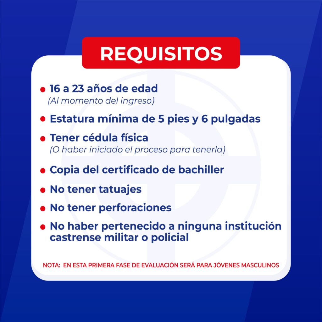 Los interesados deberán cumplir con los siguientes requisitos: tener una edad comprendida entre 16 y 23 años al momento del ingreso; poseer una estatura mínima de 5 pies con 6 pulgadas; presentar cédula de identidad y electoral, o constancia de haber iniciado el proceso para su obtención; depositar copia del certificado de bachiller; no poseer tatuajes en ninguna parte del cuerpo; no tener perforaciones en las orejas ni en ninguna otra parte del cuerpo; no haber pertenecido previamente a ninguna institución castrense, militar o policial.