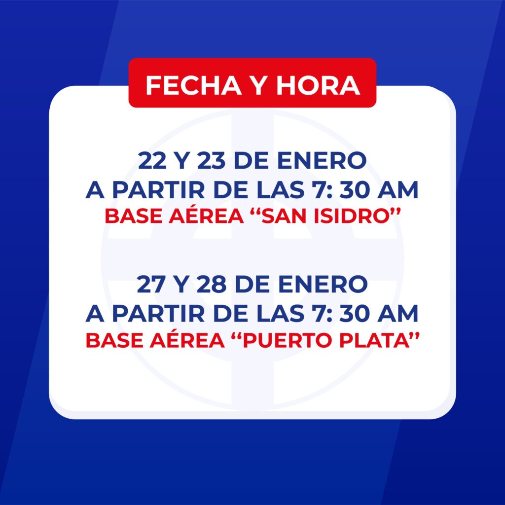 La Fuerza Aérea de República Dominicana informa a la ciudadanía que los días jueves 22 y viernes 23 de enero de 2026 en la Base Aérea San Isidro, a partir de las 07:30 horas, y los días 27 y 28 de enero en la Base Aérea Puerto Plata, dará inicio a la primera fase del proceso de evaluación, la cual será dirigida a jóvenes masculinos bachilleres interesados en ingresar como Aspirantes a Conscriptos de esta institución militar.