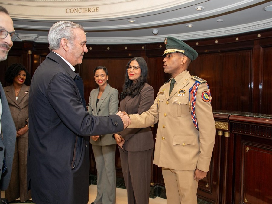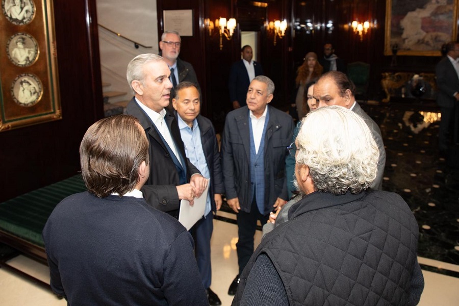 Al presidente le acompañan, los ministros, de la Presidencia, José Ignacio Paliza; de Relaciones Exteriores, Roberto Álvarez; de Educación, Luis Miguel De Camps; la directora de Ética e Integridad Gubernamental, Milagros Ortiz Bosch; y también su hija Esther Abinader, el jefe del Cuerpo de Seguridad Presidencial, Jimmy Arias, y sus asistentes Eilyn Beltrán y Noelia Shephard
